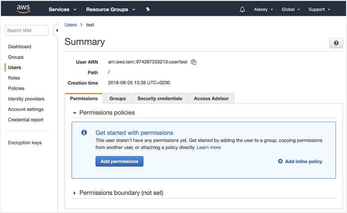 After you created your user, click on it, then on the permissions tab click “Add inline policy.”