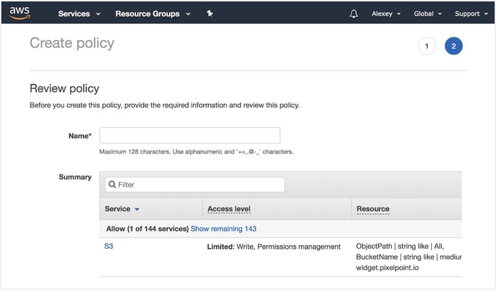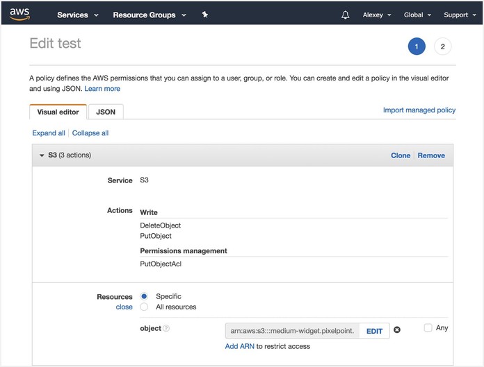 Resources: your ARN bucket name, which looks like this arn:aws:s3:::medium-widget.pixelpoint.io/*
