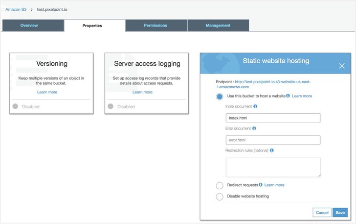 The final step is to go to your Cloudflare DNS settings and add a new CNAME record. As we noted above, your bucket name should be the same with your CNAME. In the domain name field in Cloudflare, you should put a link to your website on S3 without “http” and “/”, like this: test.pixelpoint.io.s3-website-us-east-1.amazonaws.com. In a name field, you should put your website name without domain. For example, for “test.pixelpoint.io”, we would only put “test” as a name.