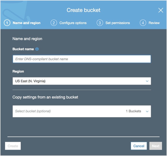 You need navigate to S3 through your AWS console and click “Create bucket”.