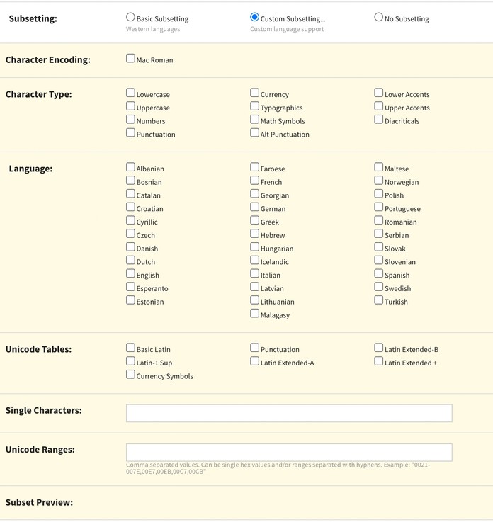 Creating subsets is easy; simply check the subsets you want to keep or write an exact character in the Single Characters field. For example, the copyright symbol is presented in the “Typographics” subset type, but if you only need ©, add it to the Single Characters field.