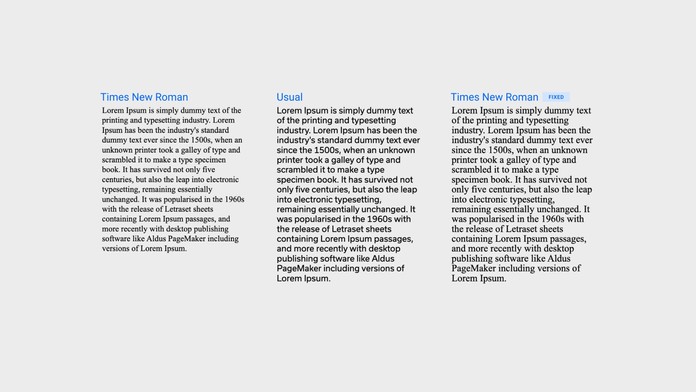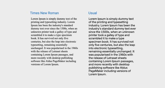 This example compares two fonts—Times New Roman and a custom font called Usual. Both fonts have a font size of 16px and a line height of 1.2 but notice the difference in length they have for the same text.